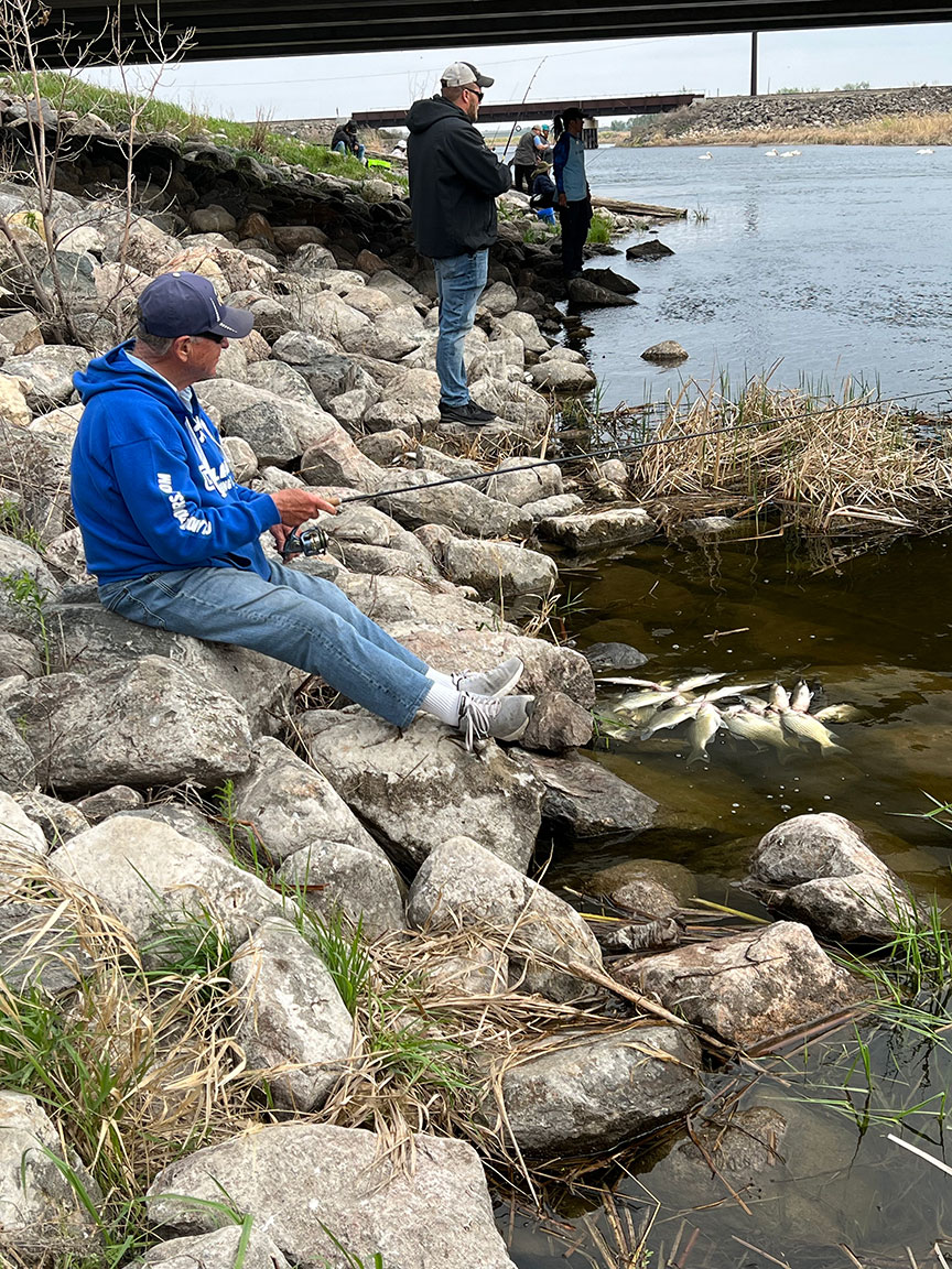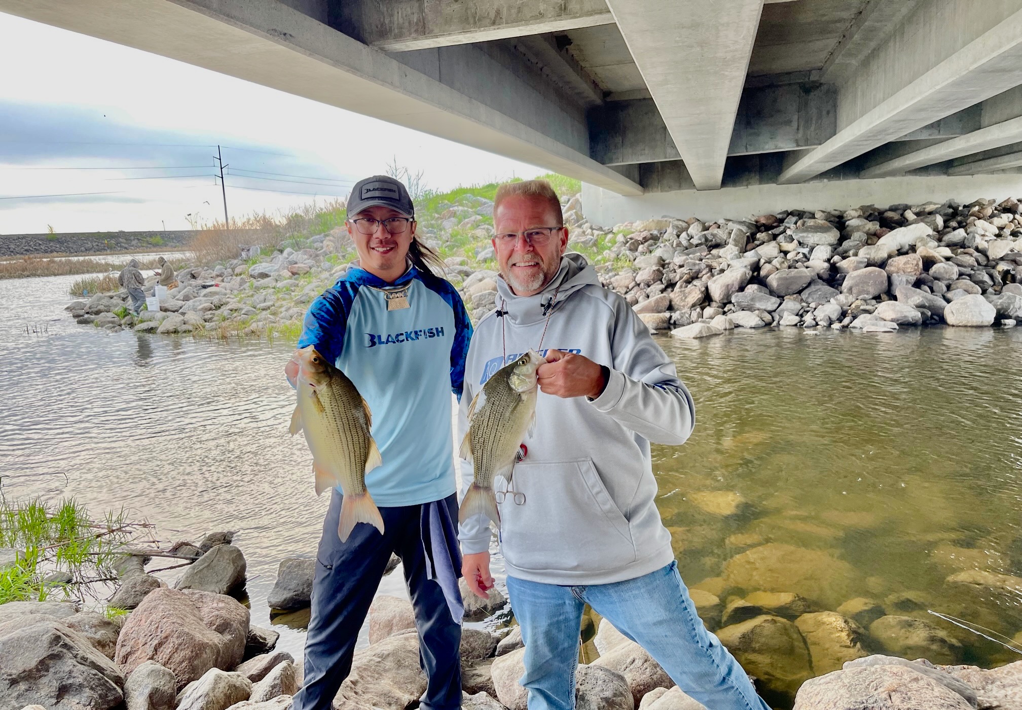 Trouble is the area was a 100-yard stretch between two bridges under the 4-lane highway with lots and lots of rocks descending a steep sidehill to the water. As a 75-year-old man, I couldn’t just walk down. I pretty much crawled down on all fours. Then my friends took me under their wing. Roger, Danny and Tyler got me to a flat rock, helped me with different baits, helped me get the treble hooks out without an accident and just plain took good care of an old man! Danny helped other anglers figure out how to better use these techniques so that they would have some nice white bass to take home.