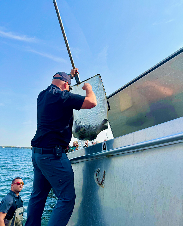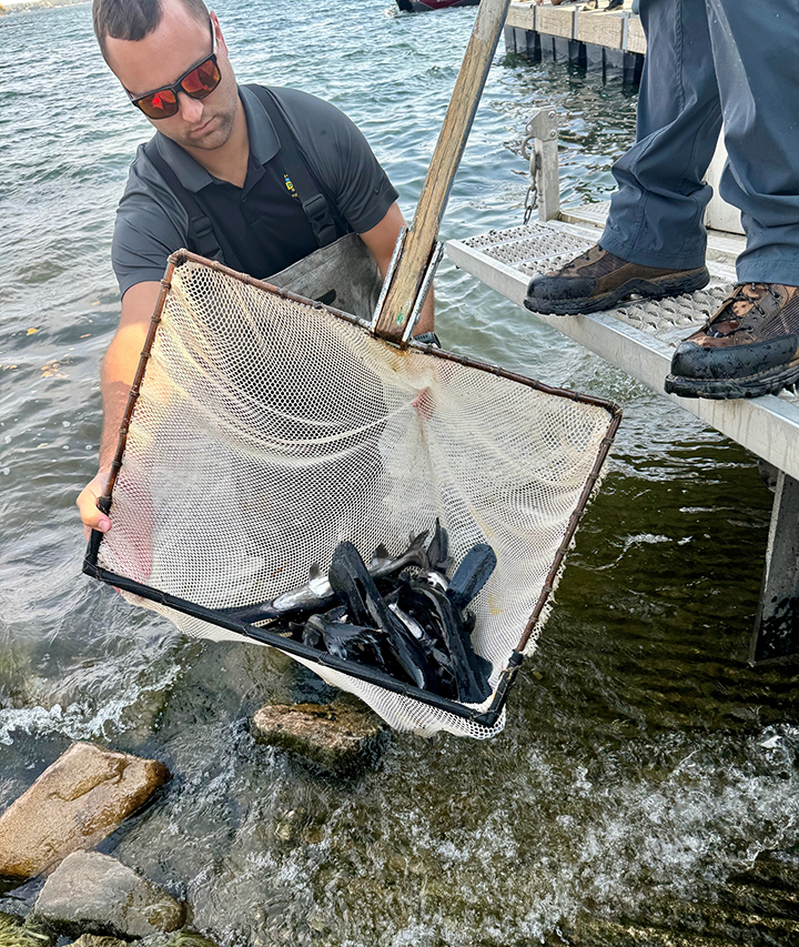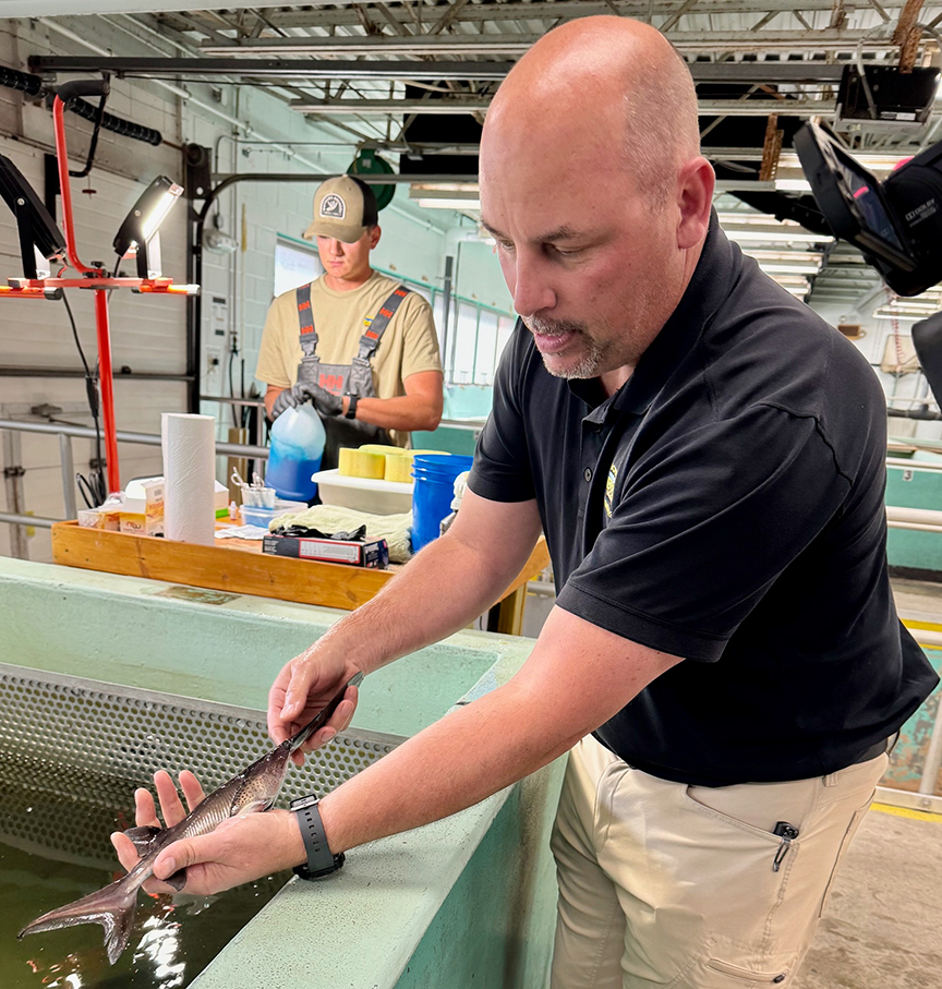 - Fisheries Biologist Mike Hawkins nets several paddlefish from the tank to be released in the water.