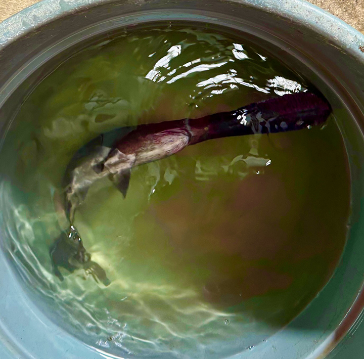 - A paddlefish waits in a tub of water to get ready for an acoustic tag.