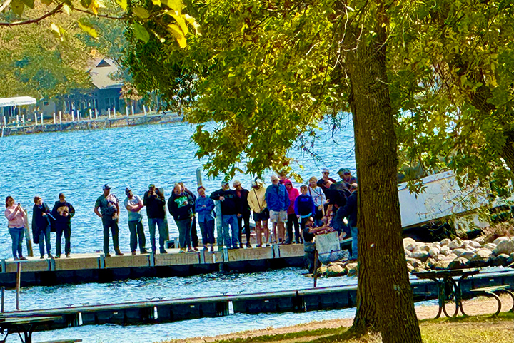 Stocking on both Wednesday and Thursday took place between 2-3 p.m. Friday was designated as media/general public day at Emerson Bay Boat Ramp as the final 400 paddlefish were released into West Lake Okoboji at approximately 1 p.m. Hawkins noted that area media were alerted of the Press Day stocking and that all people interested in viewing the stocking were invited. A crowd of an estimated 40+ people stood on both sides of the truck at the ramp and took lots of photos.