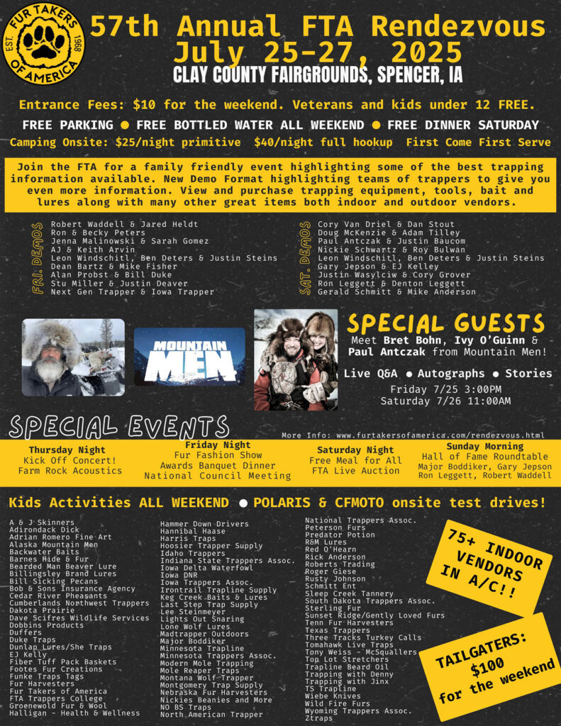 With the goal of Celebrate the Past; Educate Our Future,” the Fur Takers of America will be holding their 57th National Convention Rendezvous) at the Clay County Fairgrounds on July 25-27. According to Mike Mazur, instructor and director of the Fur Takers of America College, and also known in northwest Iowa for his many years in the fur trade market in Spirit Lake, “My wife, Kari and I decided to put this Rendezvous together and make it a weekend long event that would to showcase the fur industry to a wide range of the general public. We are expecting to have over 2,000 people in attendance over the weekend.”