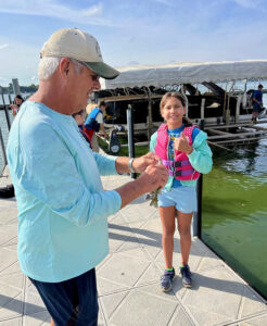 This young angler receives help from Thomsen during a youth fishing event.
