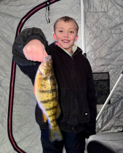 Nine-year-old George Hagedorn from Iowa City experienced ice fishing for the first time and was plenty proud of this 11”+ Big Spirit Lake perch.