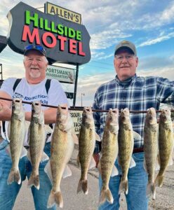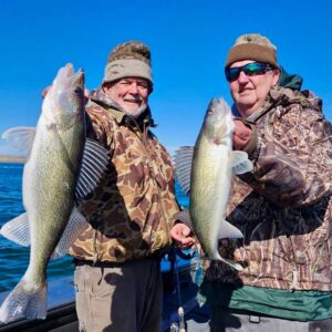 Garry Allen (L) and son Mike Allen (R) with a pair of big Missouri River walleyes.